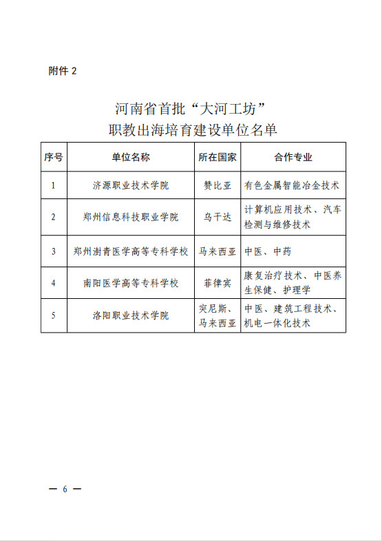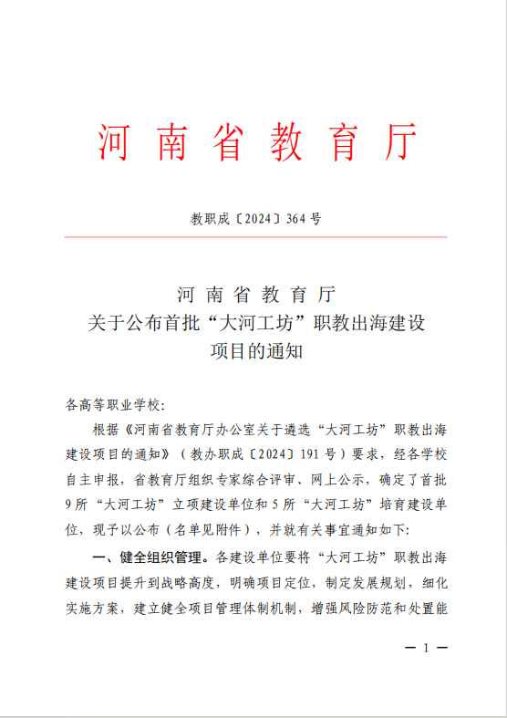 近日,河南省教育厅下发通知(教职成〔2024〕364号),正式公布首批“大河工坊”职教出海建设项目立项建设单位及培育建设单位名单,我校成功入选河南省首批“大河工坊”职教出海培育建设单位名单。