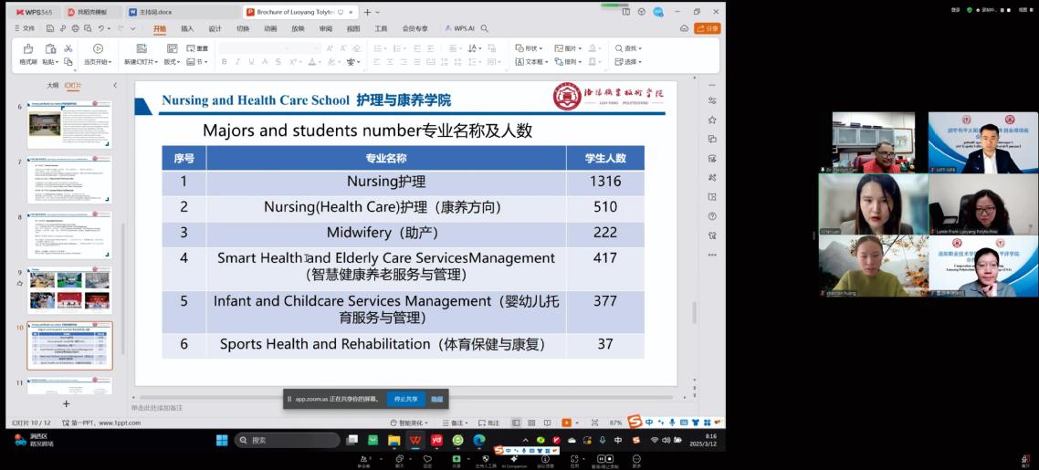 陆敏详细介绍了我校的历史沿革与基本概况,重点介绍了学校高水平专业群、国际化特色高校建设、中外合作办学等方面情况。她表示,洛阳职业技术学院与美国太平洋学院在护理、康养、智慧养老等专业领域都有教育创新合作契合点,希望双方坚持开放、合作、共赢理念,引进更多优质教育资源,丰富学校师生国际交流项目的形式与内容,促进师生海外留学、就业,开展全方位交流合作。
