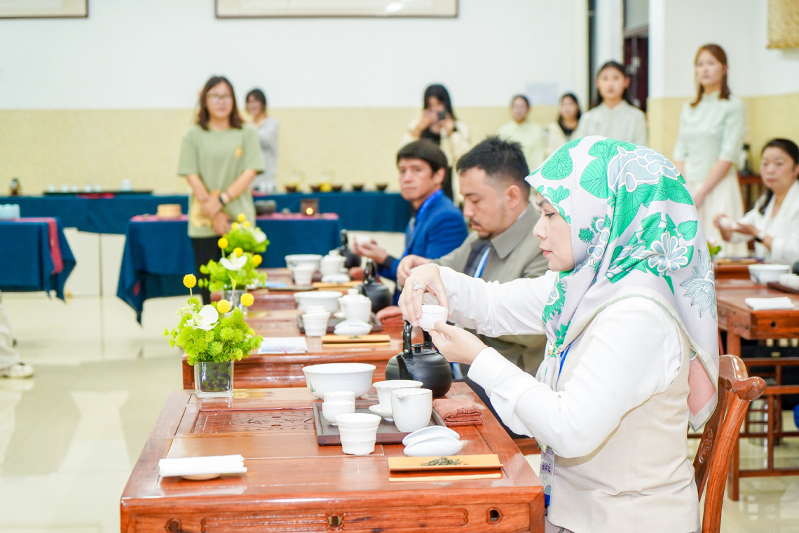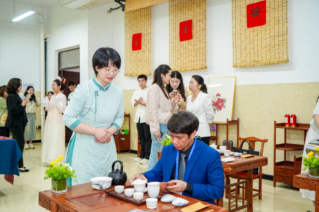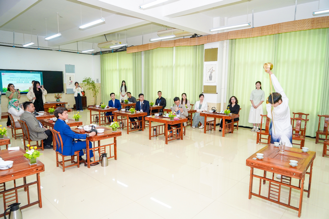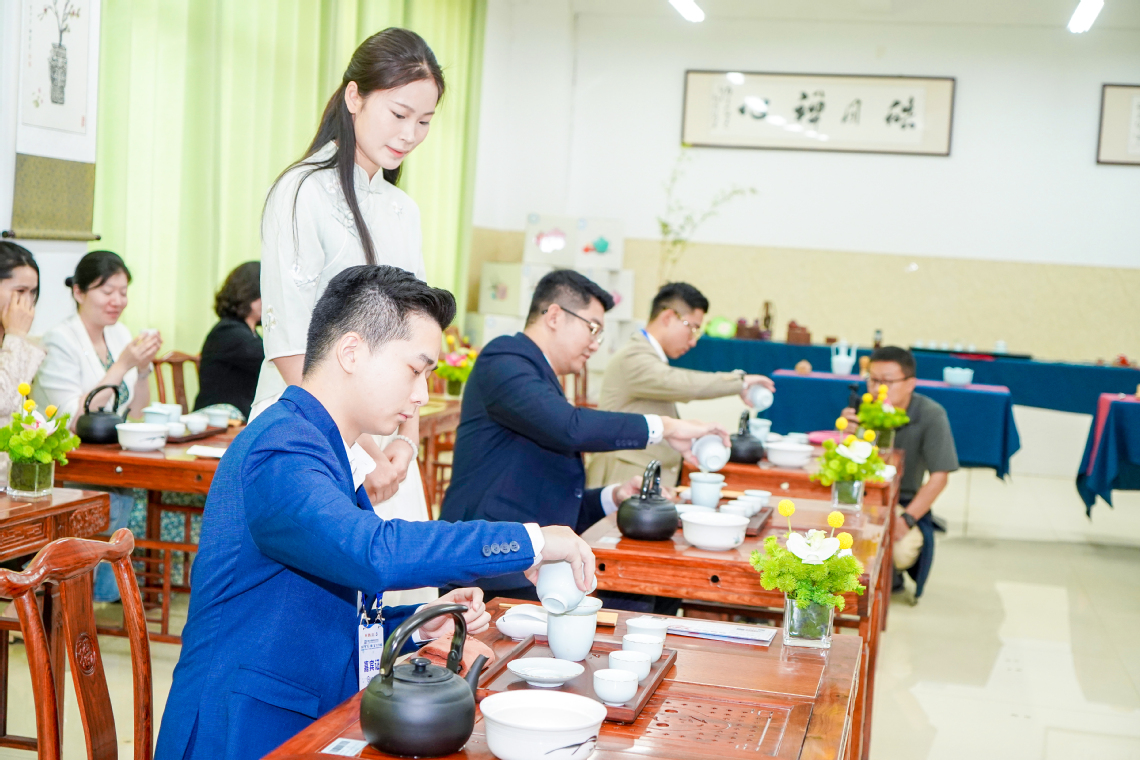 在茶艺实训室,这些国际友人观看了精彩的茶艺表演,并在老师的指导下,认真学起了冲茶、泡茶等茶艺以及喝茶、品茶的礼仪等,亲身感受历史悠久的传统茶文化,品尝各类中国名茶。