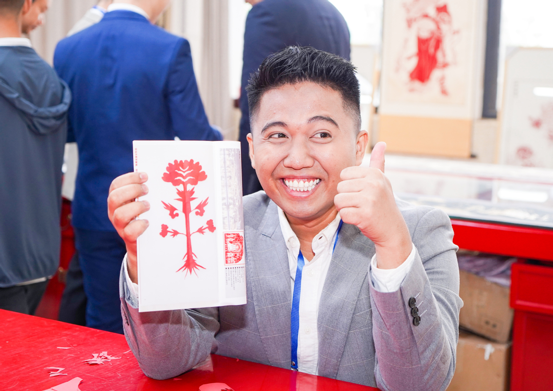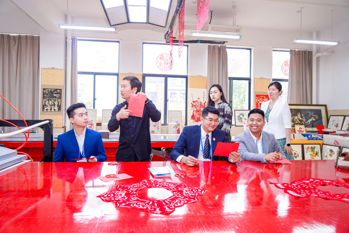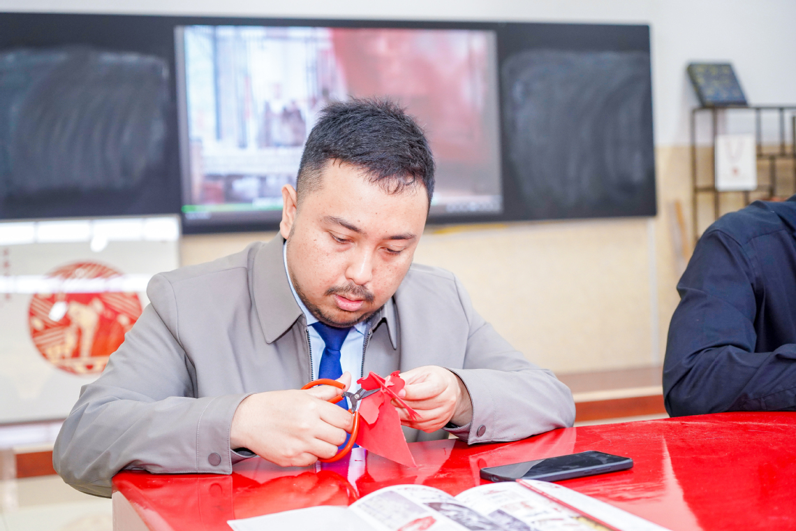 在王飞大师工作室,大家详细了解了非遗剪纸的历史,欣赏了精美的非遗剪纸作品,感受了学校非遗进校园所取得的成果。在剪纸实训室内,在剪纸艺术研究社师生的指导下,来自东盟各国的朋友们亲自动手创作了一幅幅精美的剪纸作品。