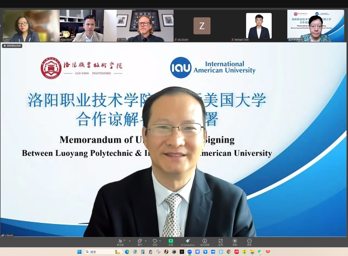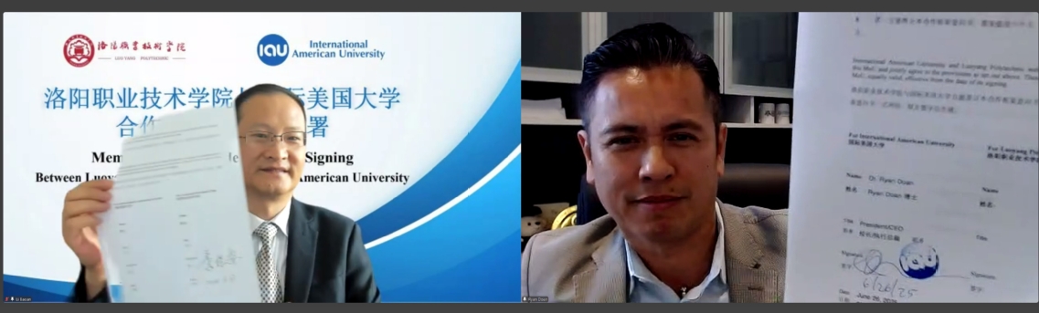 2025年6月27日,我校与国际美国大学举行合作交流会议,国际美国大学校长瑞安·H·多恩,我校校长李保安出席会议并签署合框架意向书。