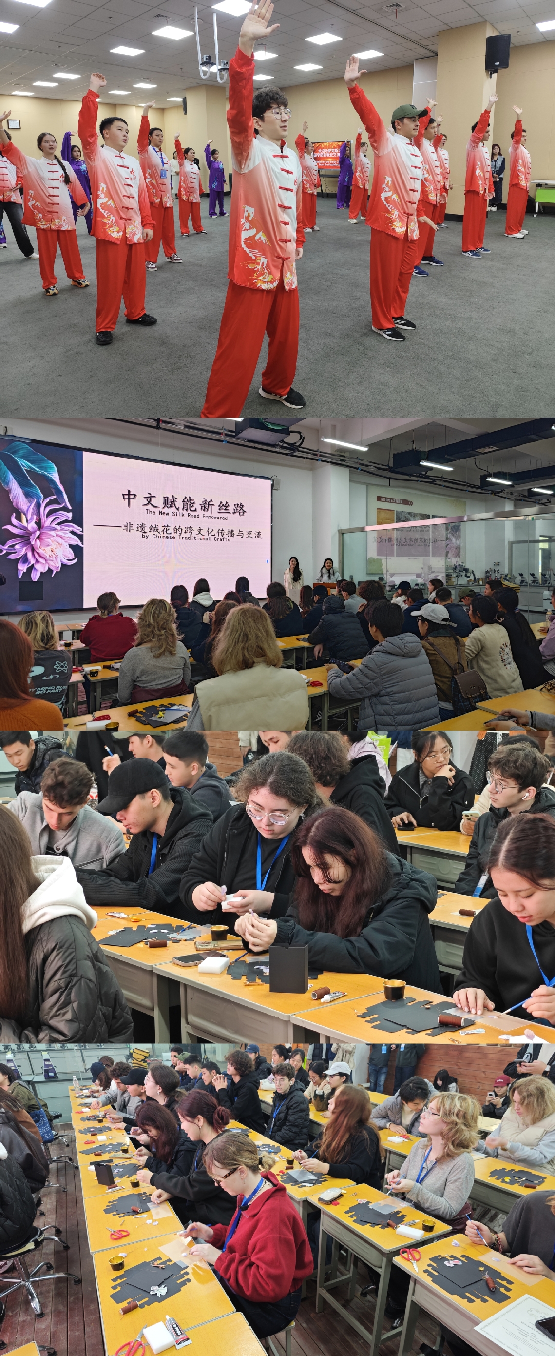 交流期间,哈萨克斯坦师生深度参与了学校精心打造的特色文化课程。在考古实训室,他们在专业老师的指导下体验考古拓印与绒花制作,亲手复刻传统工艺的精妙;剪纸实训室里,一把剪刀、一张红纸,在指尖流转间变成各具特色的非遗作品,让大家直观感受中国民间艺术的灵动。此外,学习健身气功八段锦的体验,让师生们在一招一式中体会中医养生文化的深厚底蕴,沉浸式感受中国传统文化的多元魅力。