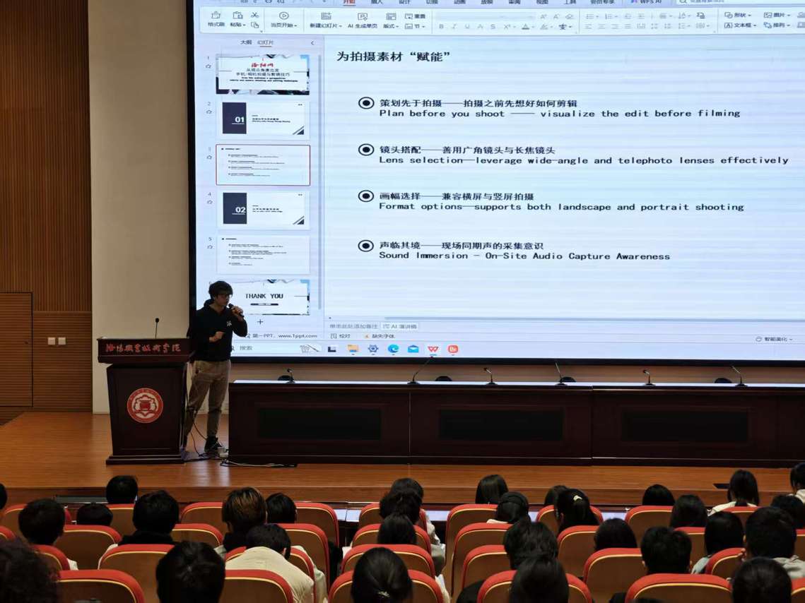 在国际化短视频培训环节,洛阳网短视频平台运营部副主任杜岚清以实战经验为依托,深入拆解爆款短视频的创作逻辑、拍摄要点与剪辑技巧,为师生解锁全球传播流量密码提供了切实可行的实践指引。