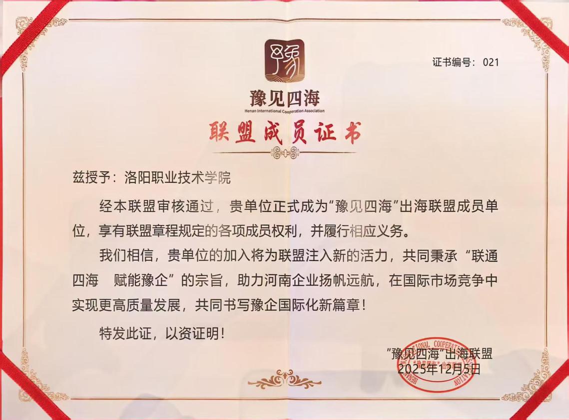 12月5日下午,在2025中国对外承包工程商会行业年会暨豫企出海央地对接会的“豫见四海”出海联盟成员证书颁发仪式上,洛阳职业技术学院被正式授予联盟成员证书,成为该联盟的重要一员。