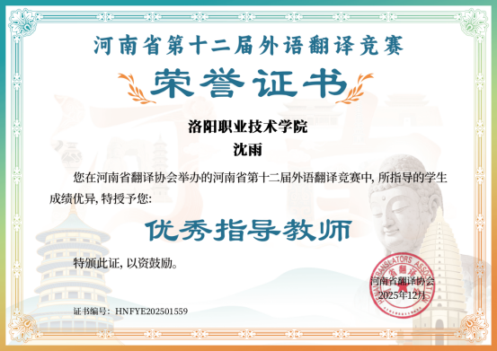 12月,竞赛正式进入角逐阶段。在高手云集的赛场中,李果妮同学沉着冷静、从容应战,凭借扎实的专业积累、清晰的逻辑思维和精准的语言转换能力,在激烈的竞争中展现出过硬的外语素养,最终成功斩获全国二等奖的优异成绩。与此同时,沈雨老师因指导成效显著,被河南省翻译协会授予“优秀指导教师”荣誉称号。