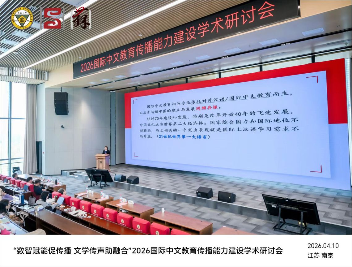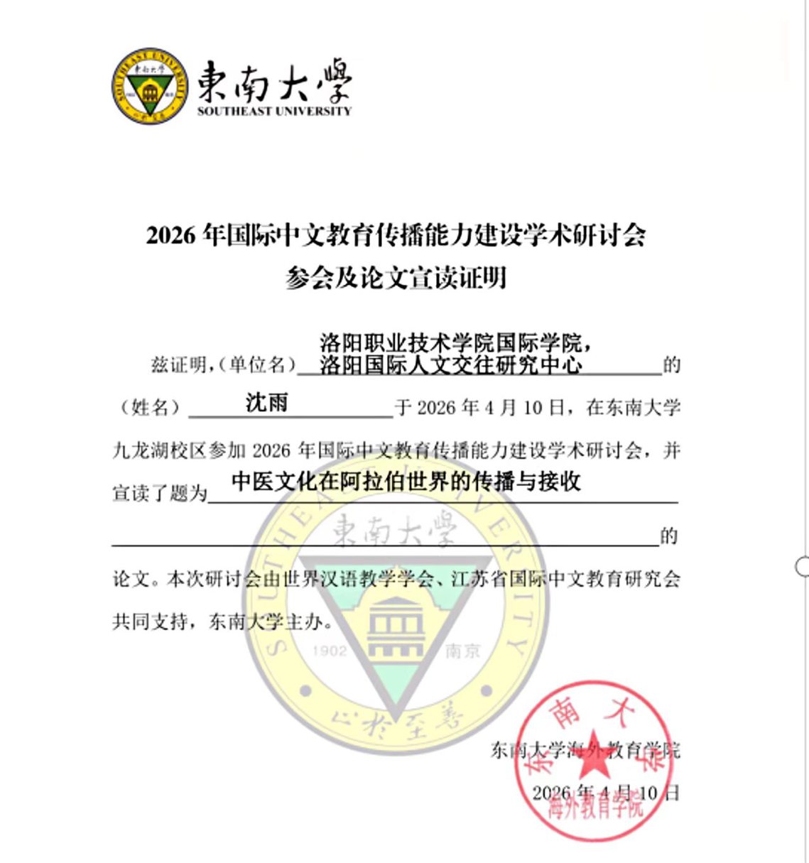 4月10日,2026年国际中文教育传播能力建设学术研讨会在东南大学九龙湖校区举行。我校国际学院教师、洛阳国际人文交往研究中心研究员沈雨受邀参会,并宣读题为《中医文化在阿拉伯世界的传播与接收》的论文,充分展示了我校在“中文 + 职业技能”、跨文化传播与职教出海领域的研究实力。