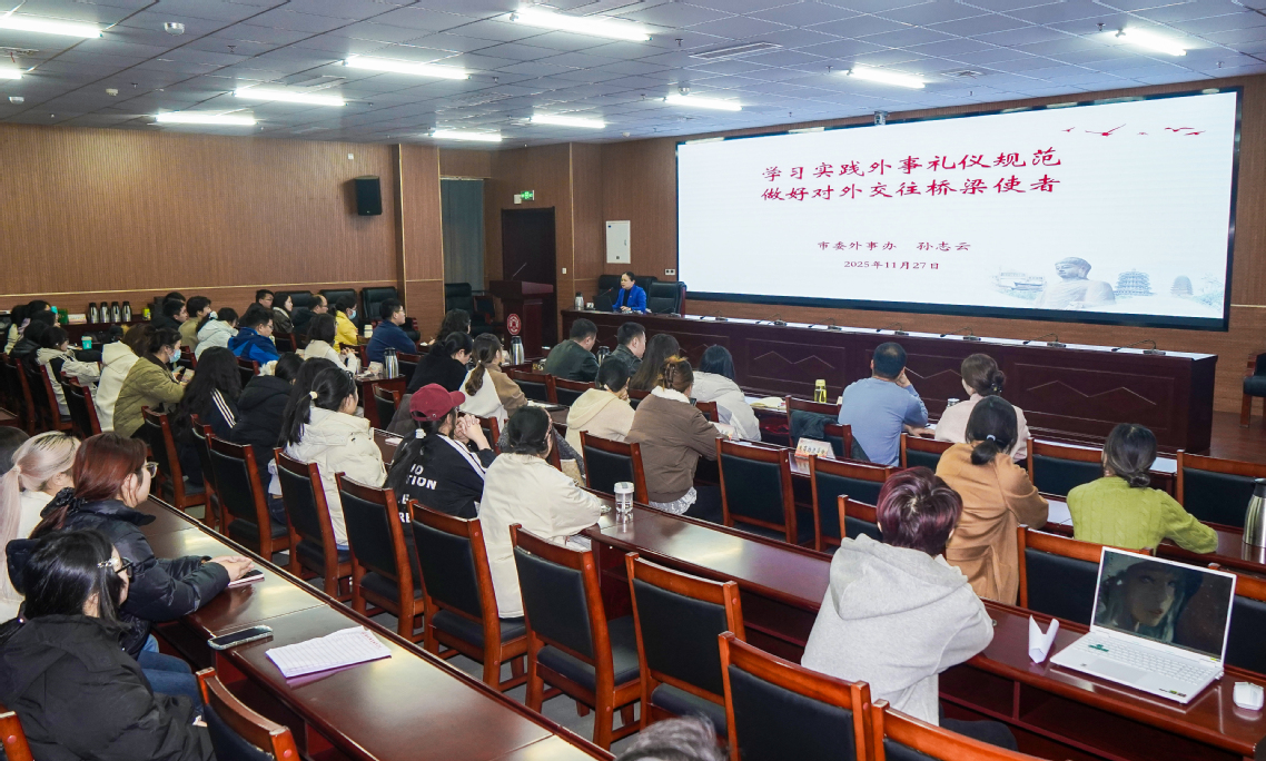 11月27日下午,洛阳市委外事办副主任孙志云同志应邀到我校作“涉外礼仪、安全及因公出国政策”的专题讲座。国际学院院长陆敏、各二级学院从事国际化教育交流活动的师生及因公出国业务办理专员在930会议室参加讲座。讲座中,孙志云结合多年外事工作经验与实际案例,从涉外交流礼仪准则、涉外安全风险防范、外事接待管理规定...